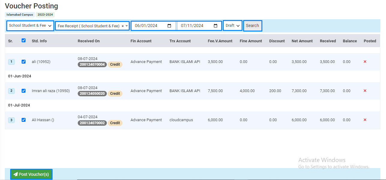 Select the fee receipt entries using checkboxes, then click "Post."