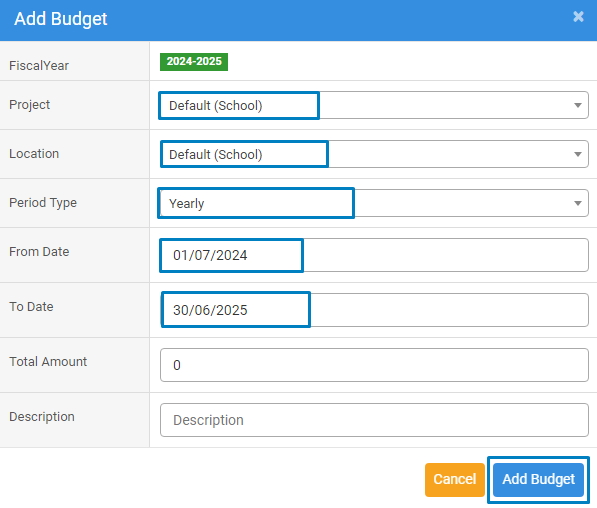 Choose a project, location, and period type, then select from and to dates. Enter a budget description, and finally, click the "Add Budget" button to complete the process.