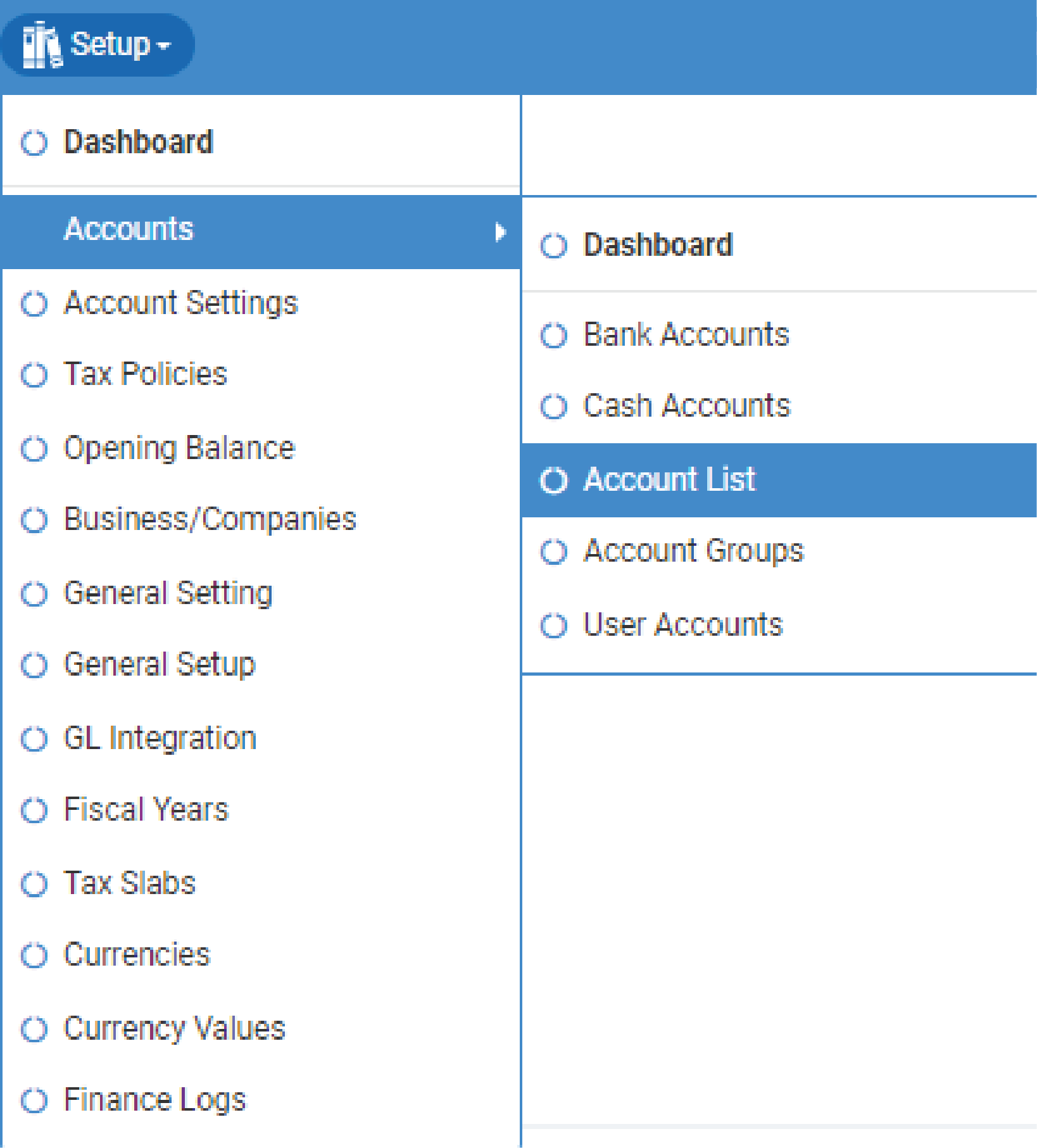 Navigate to the main menu, go to "Setup," then click on "Account" and select "Account List."