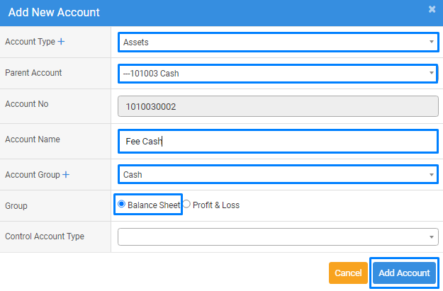 Select the account type, parent account, and enter the account name (e.g., Fee Cash, Petty Cash, etc.). Choose the appropriate account group and group category. After completing these steps, click the "Add Account" button.