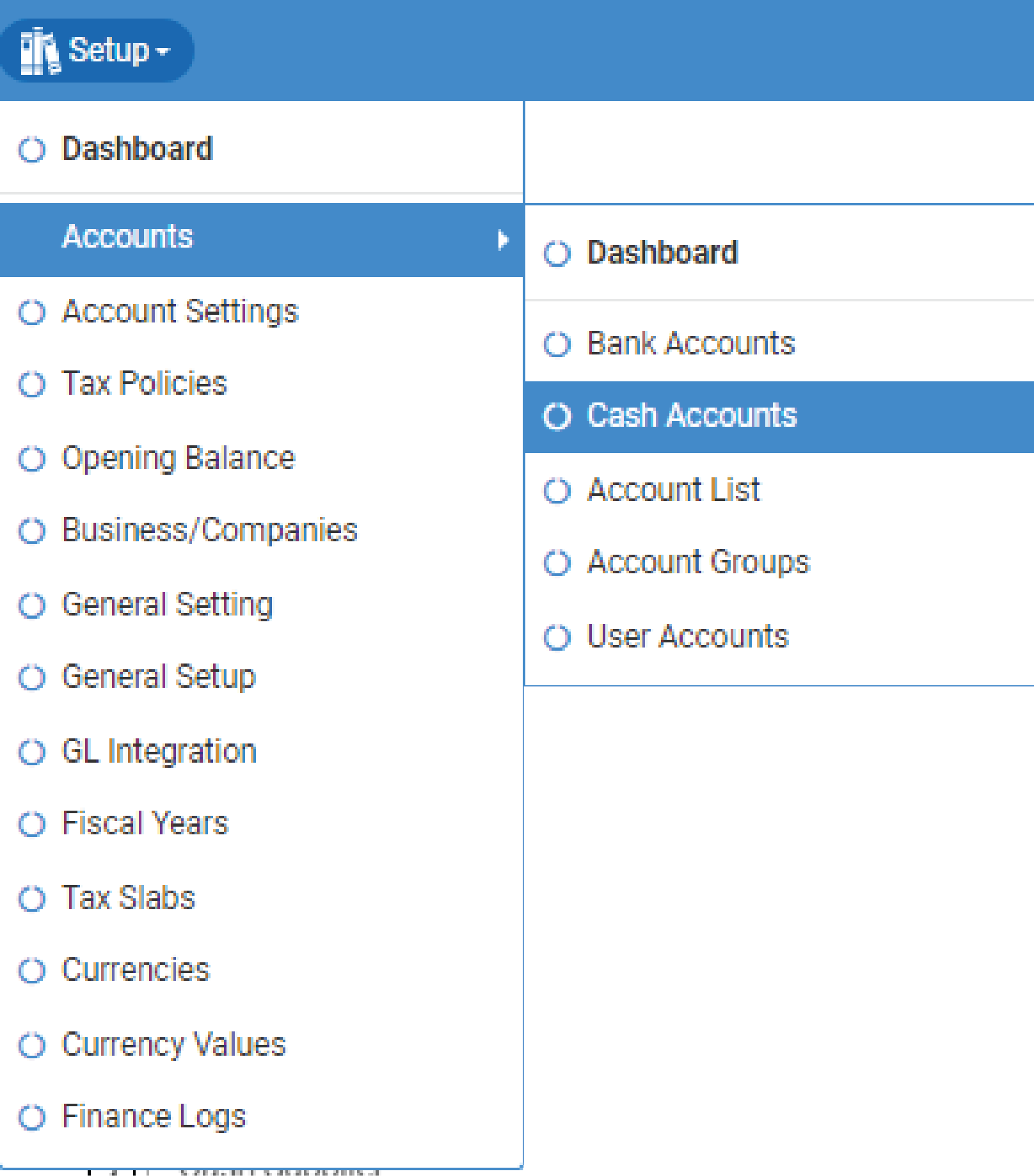 After completing these steps, verify your cash account by navigating to "Setup," clicking on "Account," and then selecting "Cash Accounts."